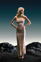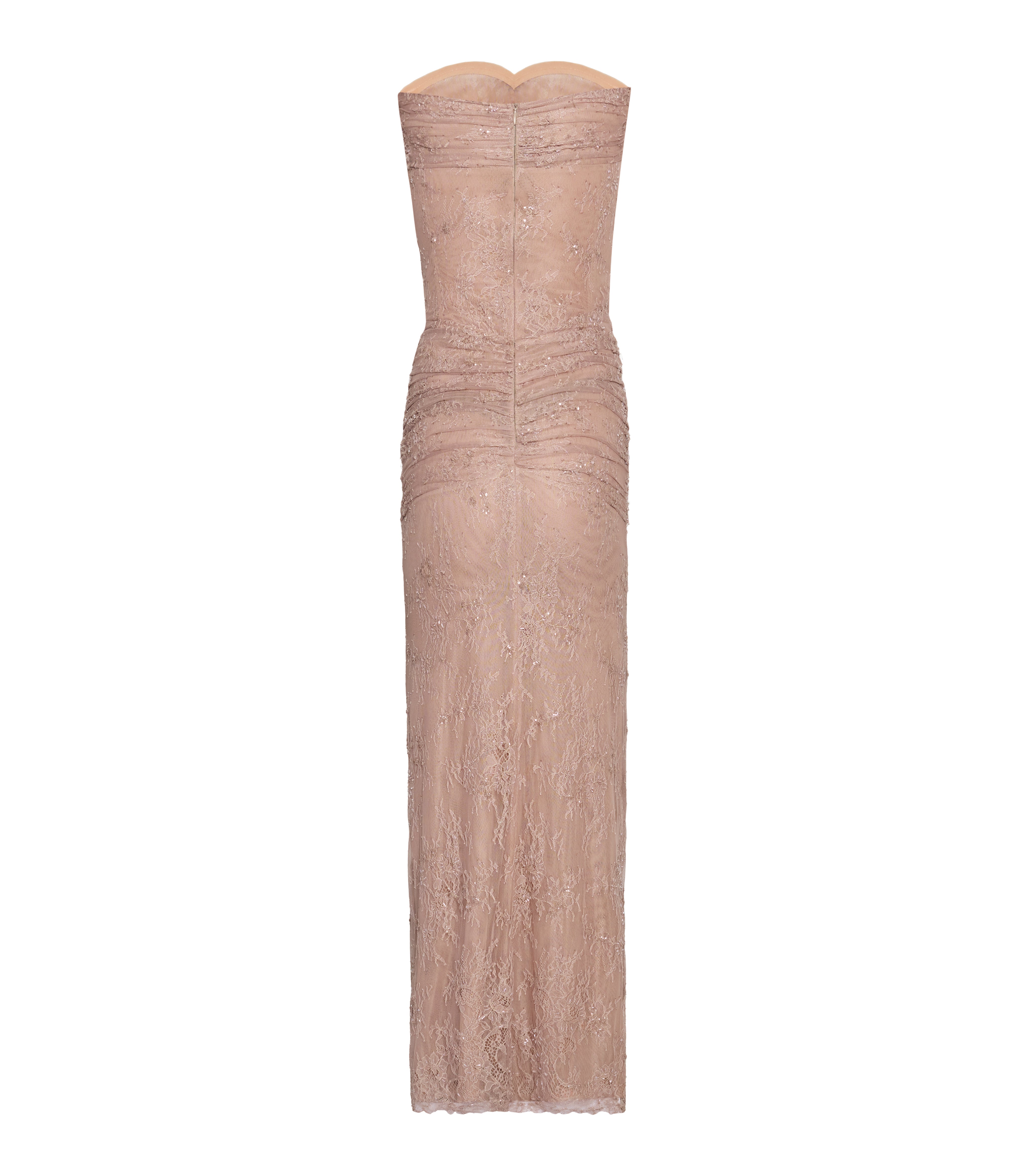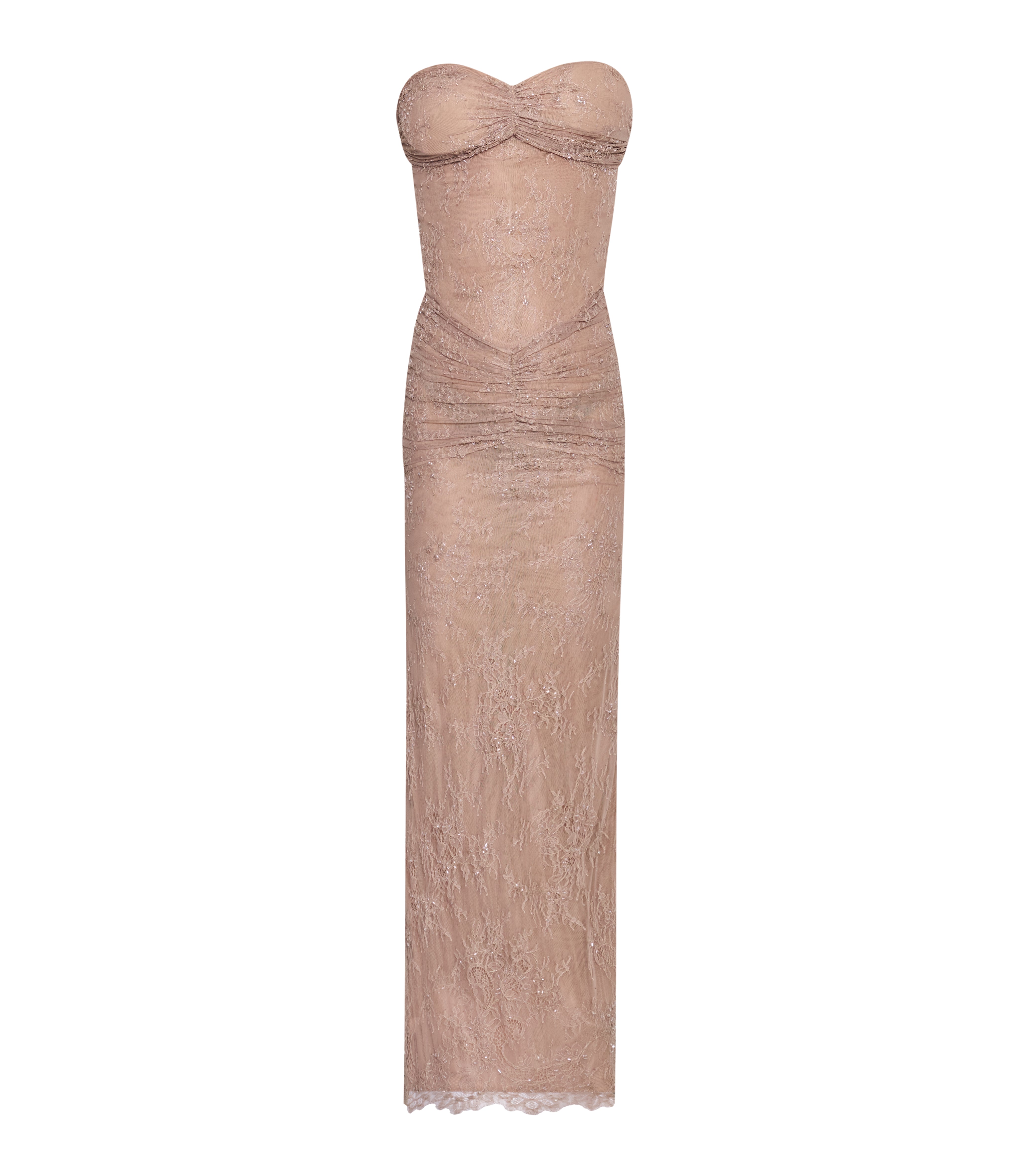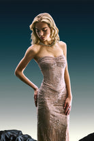 Fransız dantelinin zarif dokusu ve ince işçiliğiyle tasarlanan bu elbise, ışığı yumuşakça yansıtarak sade ama çarpıcı bir siluet sunar